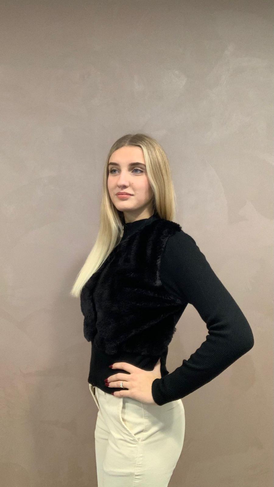 Un capo versatile ed elegante, perfetto per aggiungere un tocco di lusso e calore ai tuoi look autunnali e invernali. Questo indumento combinato unisce la praticità di un cardigan a maniche lunghe con l'eleganza di un gilet in pelliccia ecologica.