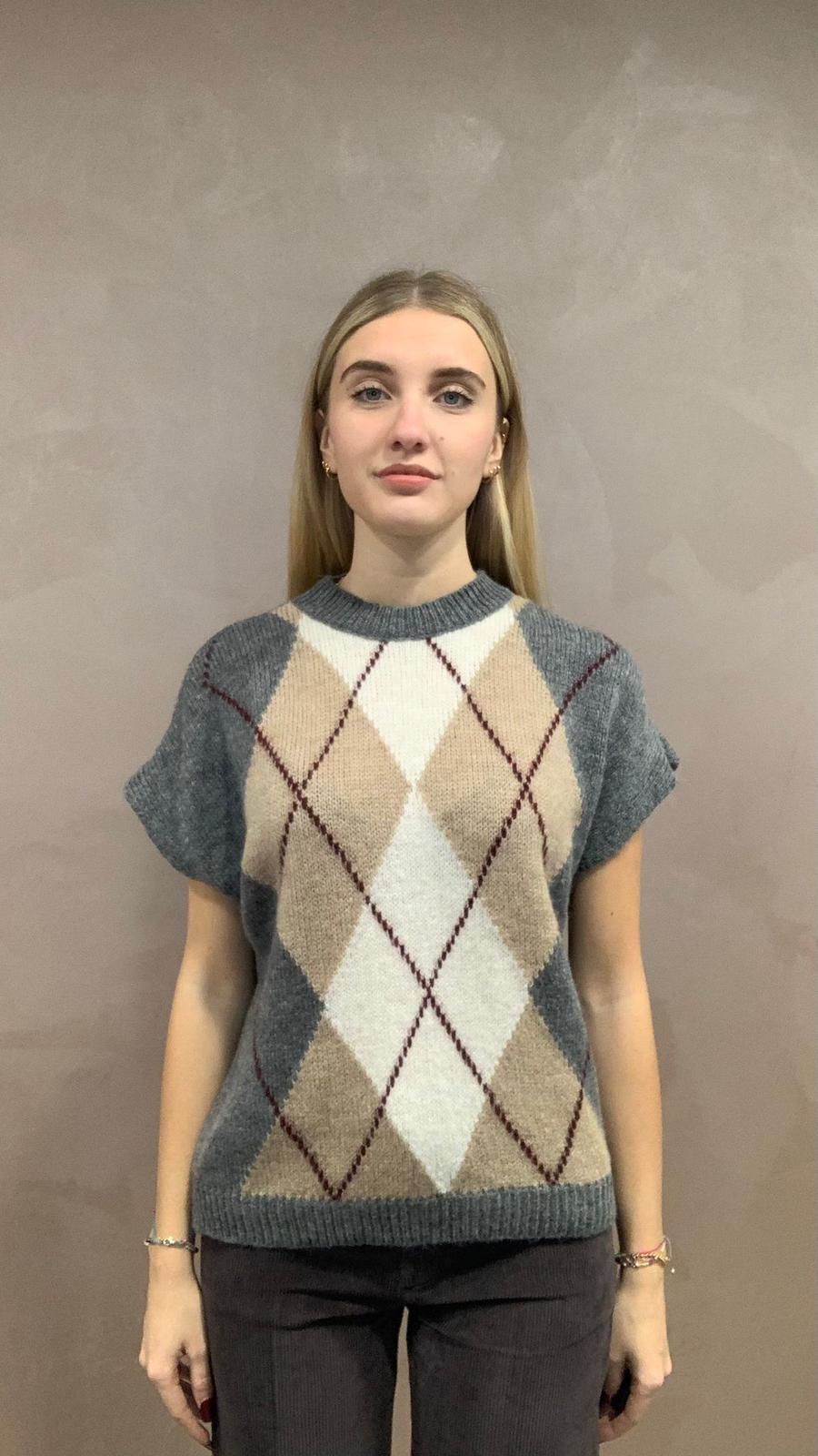 Un tributo all'eleganza intramontabile, questo gilet in maglia con la classica fantasia Argyle (losanghe) è l'accessorio perfetto per un look preppy-chic e sofisticato. Ispirato al guardaroba college, aggiunge un tocco di colore e texture ai tuoi outfit.