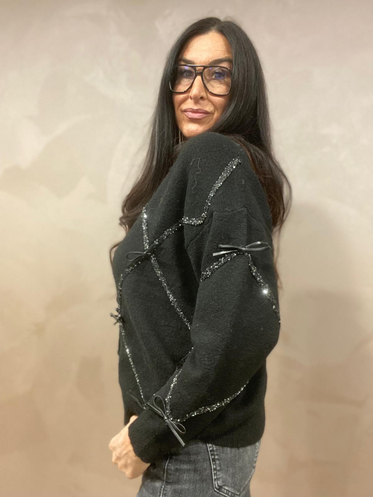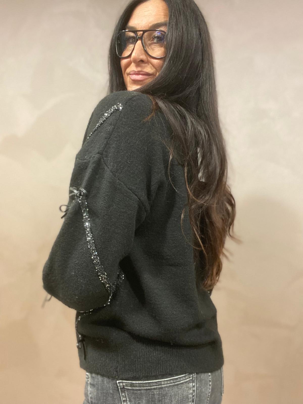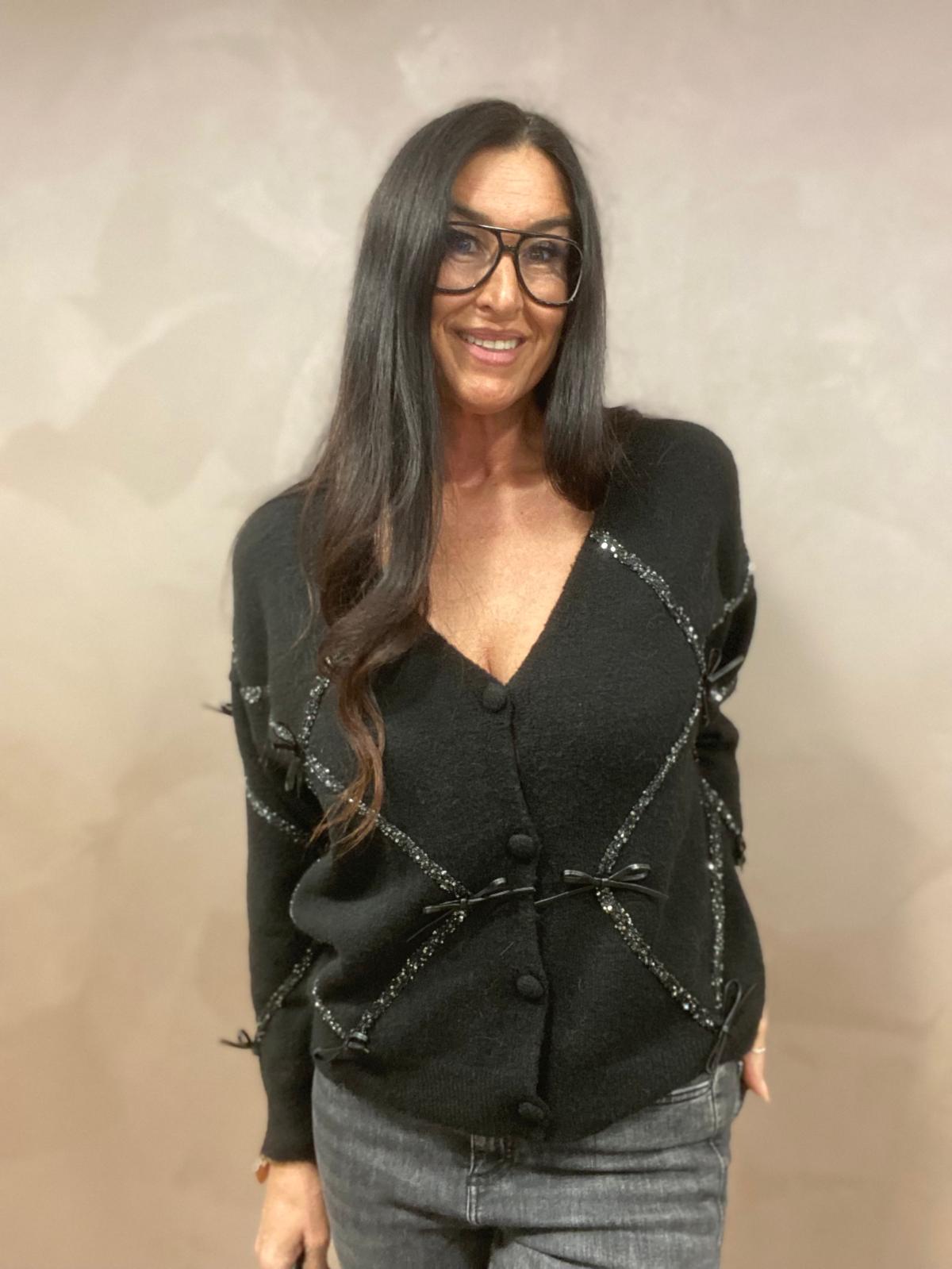 Cardigan dal fascino raffinato, impreziosito da inserti in ecopelle a forma di fiocco e dettagli di brillantini. Un capo romantico e luminoso, perfetto per valorizzare ogni outfit con un tocco di eleganza.