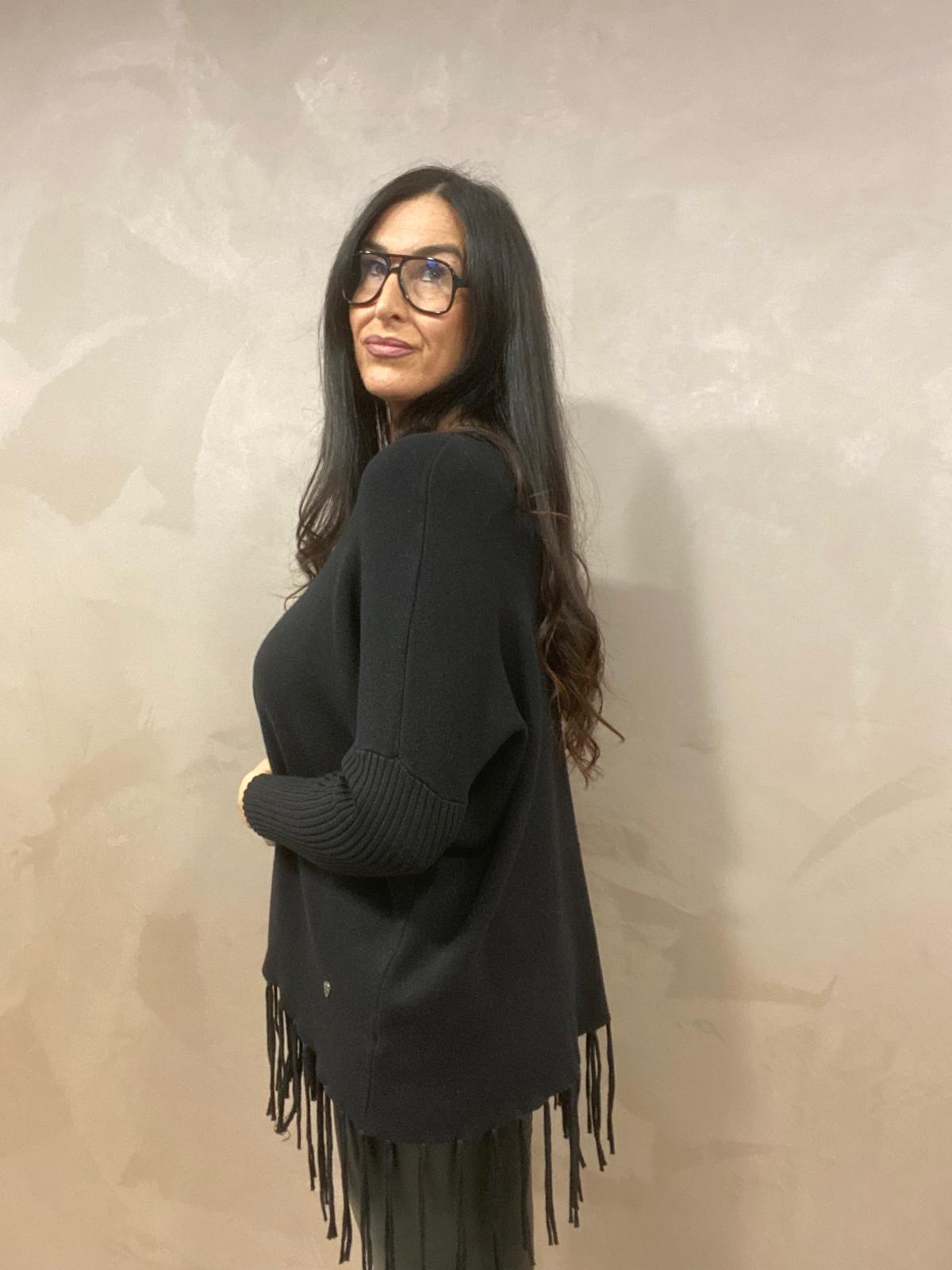 La Maglia Frange combina la semplicità del nero con la vivacità delle frange, creando un look contemporaneo e sofisticato.