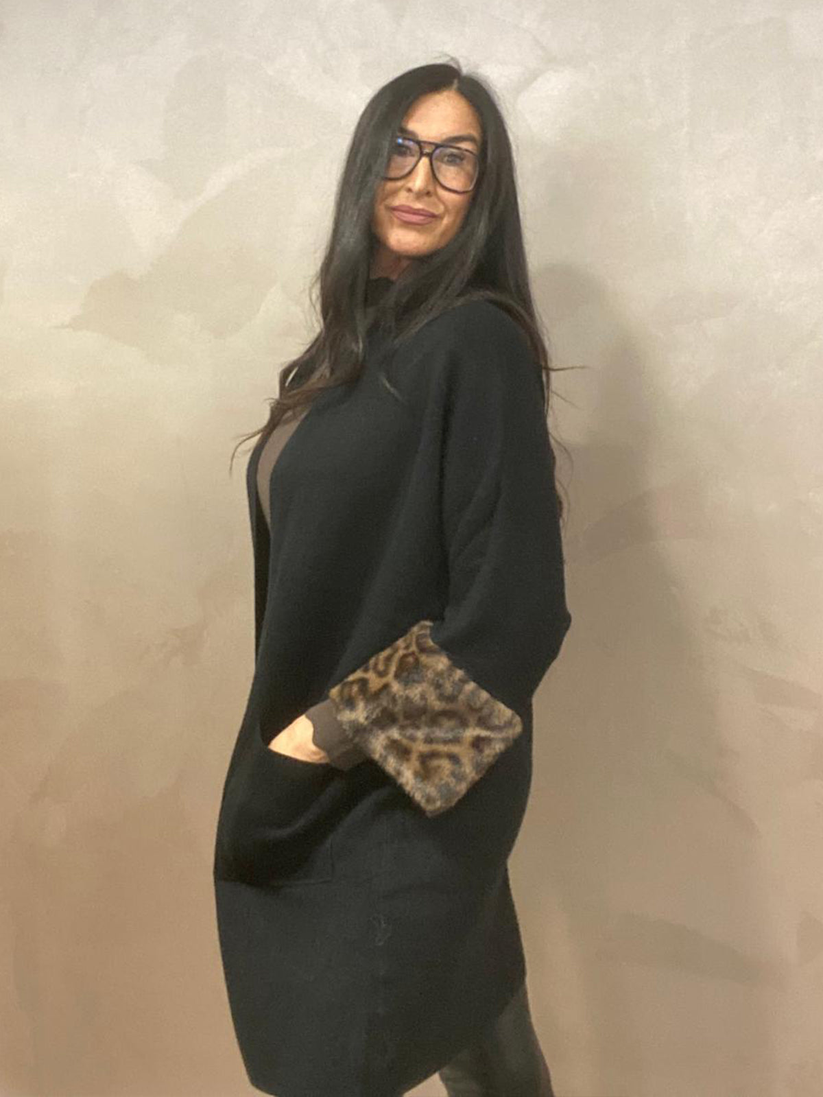 Un capo che unisce raffinatezza e carattere: il Cardigan Wild Touch si distingue per i dettagli animalier in aco-pelliccia che ne esaltano lo stile contemporaneo.